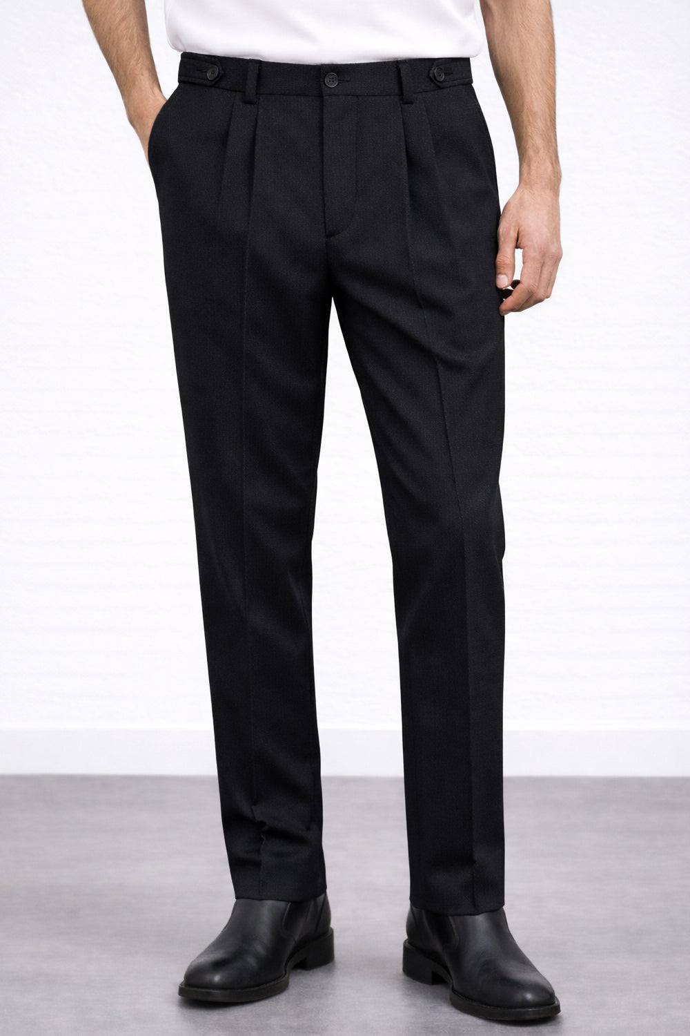 Designed for the perfect fit, these pleated pants feature an innovative adjustable waist with two additional buttons. The button strip includes elastic to provide a smooth and comfortable fit, preventing any unwanted bunching at the waistline. With a stylish relaxed fit and sharp pleats, these pants bring a touch of sophistication to any semi-formal occasion, delivering both comfort and elegance.
