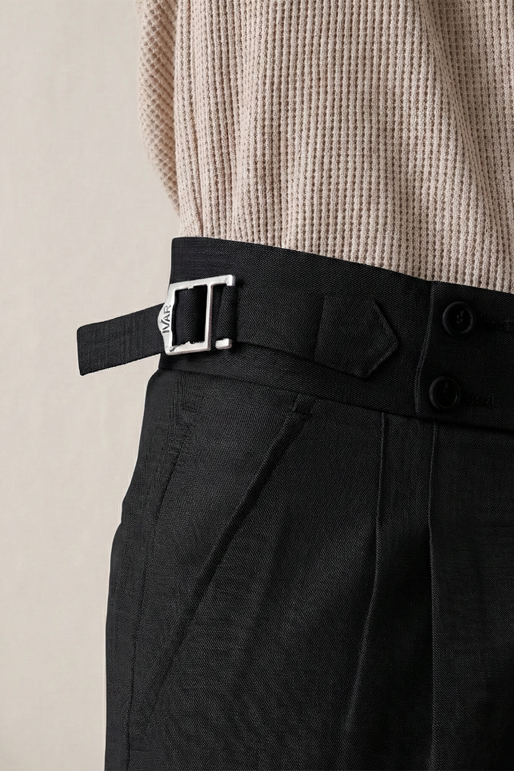 Signature Gurkha Waistband – Adjustable dual-buckle system for a sharp, tailored fit without needing a belt.
