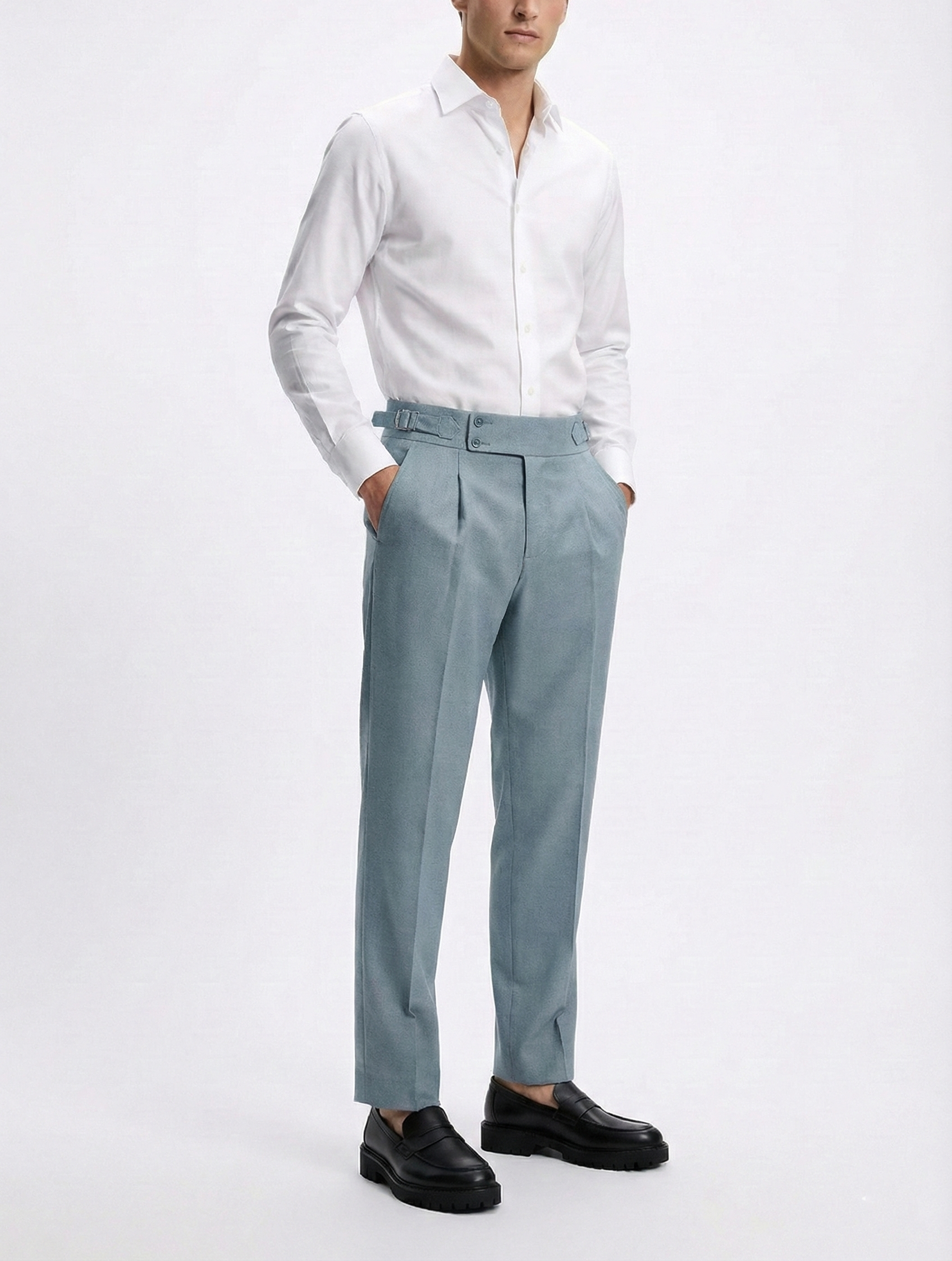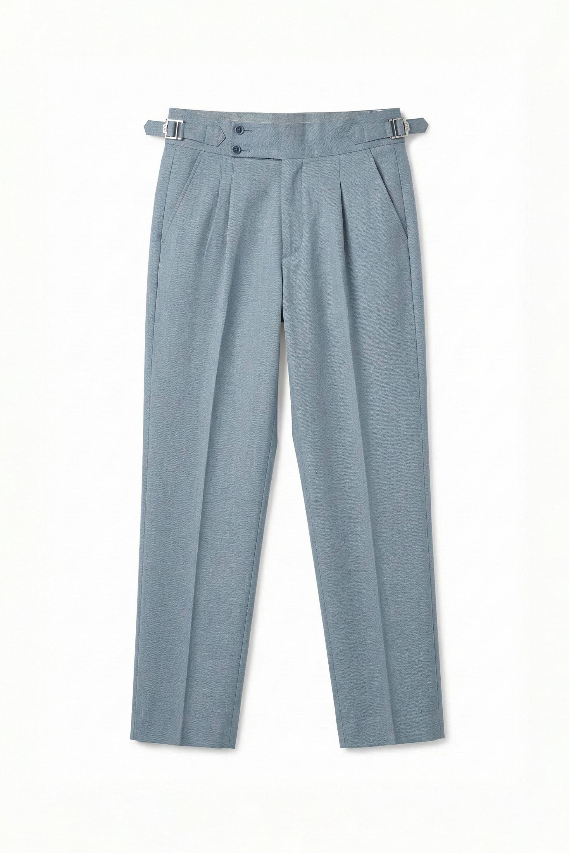 Signature Gurkha Waistband – Adjustable dual-buckle system for a sharp, tailored fit without needing a belt.