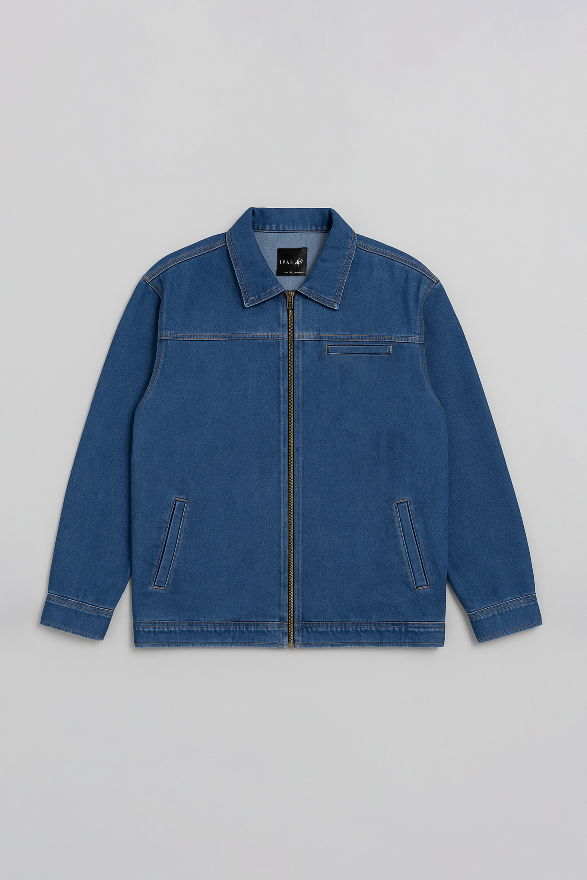 The Ivar Oversized Denim Zipper Jacket is a trendy, relaxed-fit jacket made from durable denim, featuring a modern front zipper, deep pockets, and subtle distressed details. Ideal for layering, it offers a blend of urban style and comfort.
